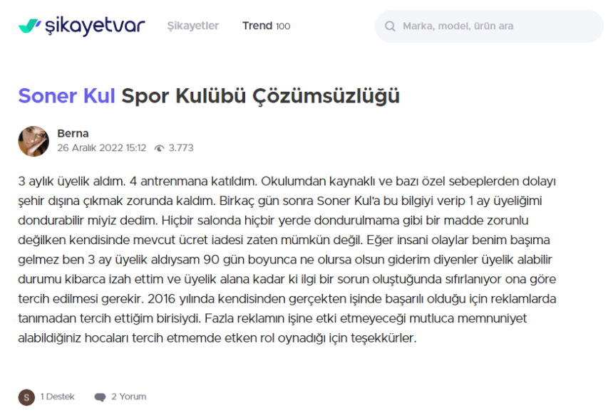 3 aylık üyelik aldım. 4 antrenmana katıldım. Okulumdan kaynaklı ve bazı özel sebeplerden dolayı şehir dışına çıkmak zorunda kaldım. Birkaç gün sonra Soner Kul'a bu bilgiyi verip 1 ay üyeliğimi dondurabilir miyiz dedim. Hiçbir salonda hiçbir yerde dondurulmama gibi bir madde zorunlu değilken kendisinde mevcut ücret iadesi zaten mümkün değil. Eğer insani olaylar benim başıma gelmez ben 3 ay üyelik aldıysam 90 gün boyunca ne olursa olsun giderim diyenler üyelik alabilir durumu kibarca izah ettim ve üyelik alana kadar ki ilgi bir sorun oluştuğunda sıfırlanıyor ona göre tercih edilmesi gerekir. 2016 yılında kendisinden gerçekten işinde başarılı olduğu için reklamlarda tanımadan tercih ettiğim birisiydi. Fazla reklamın işine etki etmeyeceği mutluca memnuniyet alabildiğiniz hocaları tercih etmemde etken rol oynadığı için teşekkürler.